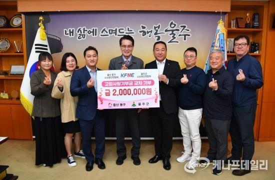 케나프데일리 이은성 기자 | 울주군 소상공인연합회와 울산 동구 소상공인연합회가 21일 고향사랑기부제 활성화와 지역 상생 발전을 위해 상호 지자체에 200만원씩 교차 기부를 실시했다.