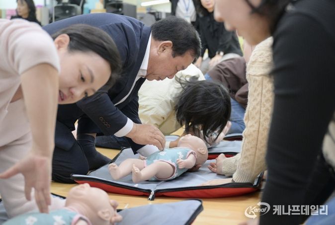 케나프데일리 이은성 기자 | 최민호 세종특별자치시장이 21일 종촌동 육아종합지원센터에서 ‘찾아가는 현장소통’을 열고 영유아 학부모 40여 명과 함께 심폐소생술을 재숙지하고 응급대처의 중요성을 공유했다.