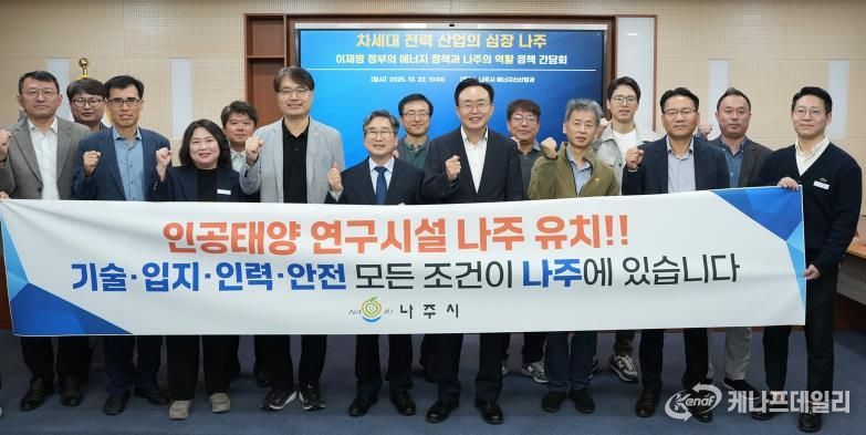 또한 간담회 참석자들은 ‘인공태양 연구시설 나주 유치’를 염원하는 퍼포먼스를 진행하며 정부 공모사업 대응 의지를 함께 다졌다.