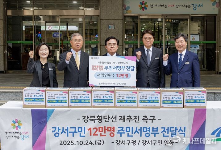 케나프데일리 이은성 기자 | 서울 강서구는 24일 강북횡단선 신속 재추진을 위한 12만 주민 서명부 전달식을 개최했다.