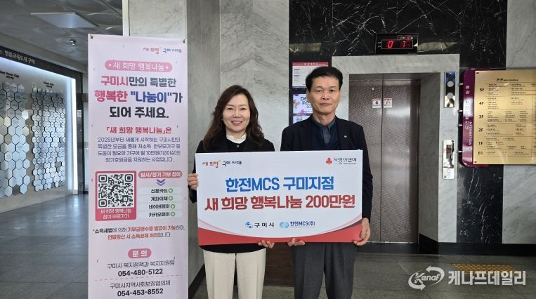 케나프데일리 이은성 기자 | 구미시는 지난 18일 한전MCS 구미지점(지점장 정경우)으로부터 '새 희망 행복나눔' 성금 200만원을 기탁받았다.