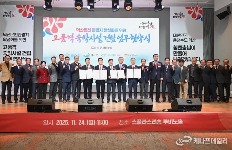 케나프데일리 이은성 기자 | 예산군은 24일 충청남도, 충남개발공사, ㈜호반호텔앤리조트와 함께 덕산온천관광지에 고품격 숙박시설 및 컨벤션 기능을 갖춘 복합 휴양시설 건립을 위한 업무협약(MOU)을 체결했다.