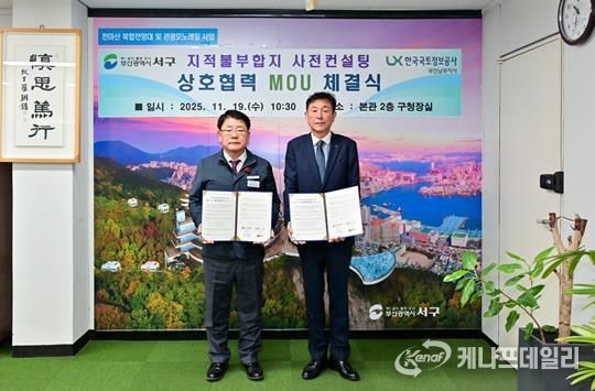 케나프데일리 이은성 기자 | 부산 서구는 지난 19일 서구청 본관2층 구청장실에서 한국국토정보공사(LX) 남부지사와‘지역 공공사업 지적업무의 효율적 추진을 위한 지적불부합지 사전컨설팅 업무협약(MOU)’을 체결했다.