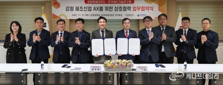 케나프데일리 이은성 기자 | 강원특별자치도는 11월 27일 오후 3시, 강원 제조산업의 AX(AI Transformation, 인공지능 전환)를 위한 상호 협력을 강화하기 위해 한국생산기술연구원(원장 이상목)과 업무협약(MOU)을 체결했다.