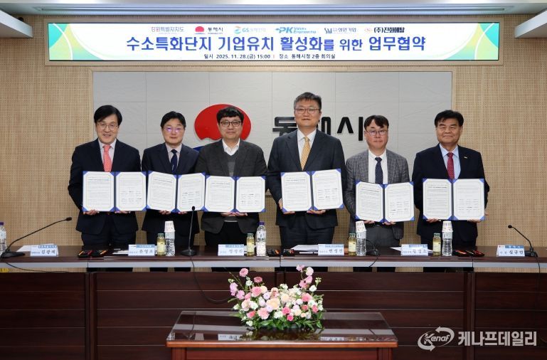 케나프데일리 이은성 기자 | 동해시는 11월 28일 동해시청 본관 2층 회의실에서 강원특별자치도, 피케이밸브앤엔지니어링㈜, ㈜성원기업, ㈜진화메탈, ㈜GS동해전력과 함께 수소특화단지 기업유치 활성화를 위한 업무협약(MOU)을 체결했다고 밝혔다.