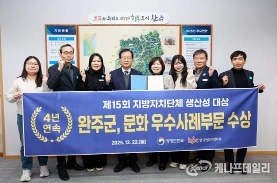 케나프데일리 이은성 기자 | 완주군이 ‘무장애 문화’를 행정 전반에 접목한 정책 성과를 인정받아, 행정안전부가 주최하고 한국생산성본부가 주관한 ‘제15회 지방자치단체 생산성대상’ 문화분야에서 기관표창을 수상했다.