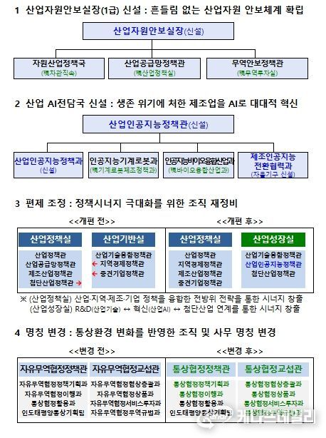 이번 조직개편은 국민주권정부 국정과제의 속도감 있는 이행을 위한 조직 기능 강화와 에너지기능 분리 이후 자원산업 재배치, 지역 성장 및 기업 활력 제고 등 정책시너지 창출을 위한 조직 재정비 차원에서 마련됐다.