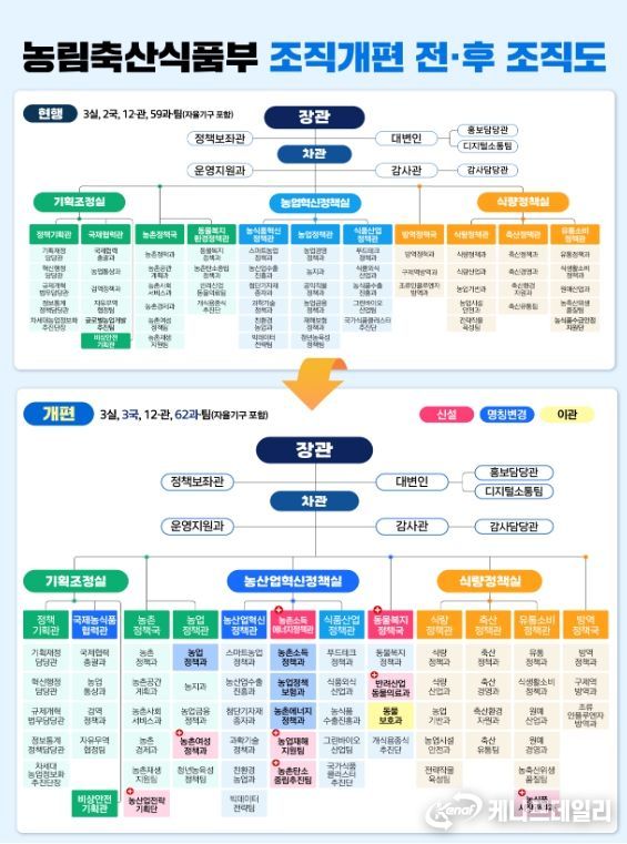 농식품부는 이번 조직 개편을 통해 1관 신설, 1국(관) 대체 신설, 21명 증원함으로써 기존 3실, 2국‧12관, 59과‧팀에서 3실, 3국‧12관, 62과‧팀 체계로 확대되며, 2017년 방역정책국 신설(순증), 2022년 동물복지환경정책관 신설(대체신설) 이후 3년여 만에 대규모 조직개편을 단행하게 됐으며, 세부 내용은 다음과 같다.