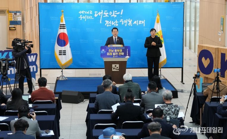 케나프데일리 이은성 기자 | 김영록 전라남지사는 24일 동부지역본부에서 열린 동부권 송년 기자 브리핑에서 2026년을 ‘동부권 100년 대도약의 원년’으로 선포하고 전남 미래 성장의 핵심 거점으로 육성하는 동부권 발전 전략을 발표했다.