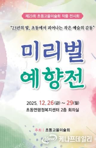김영근 초동면장은 “미리벌 예향전은 예술이 특정 공간에 머무르지 않고, 지역과 일상 속으로 스며드는 뜻깊은 전시다”라며 “이번 전시를 통해 지역 주민들이 예술의 따뜻한 울림을 가까이에서 느끼고, 초동면이 문화와 예술이 살아 숨 쉬는 고장임을 함께 공감하는 시간이 되길 바란다”라고 전했다.