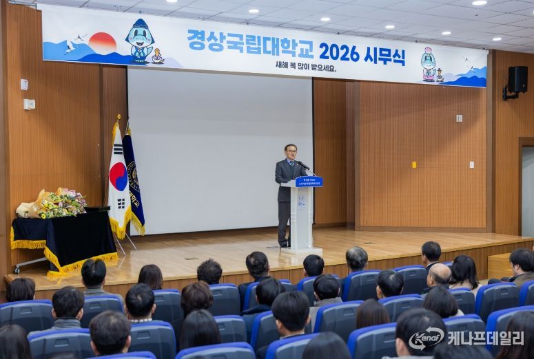 케나프데일리 이은성 기자 | 경상국립대학교는 1월 2일 오전 11시 가좌캠퍼스 박물관 대강당에서 2026년 시무식을 개최했다. 시무식은 개식, 국민의례, 총장 신년사, 시상식, 폐식, 기념촬영의 순으로 진행됐다.