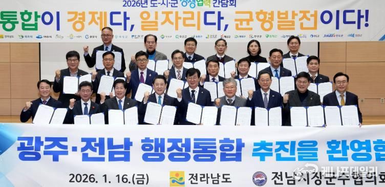 케나프데일리 이은성 기자 | 전라남도는 16일 전남도청 왕인실에서 ‘2026년 도-시군 상생협력 간담회’를 열어 지역 대도약을 위한 광주·전남 행정통합 추진에 도와 22개 시군이 공동 보조를 맞추기로 했다.