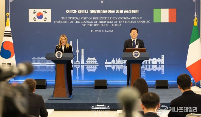 케나프데일리 이은성 기자 | 이재명 대통령은 19일 조르자 멜로니 이탈리아 총리와의 정상회담 뒤 "저와 멜로니 총리는 전략적 동반자 명칭에 부합하는 미래지향적 수준으로 양국 관계를 더욱 발전시켜 나가기로 합의했다"고 밝혔다.