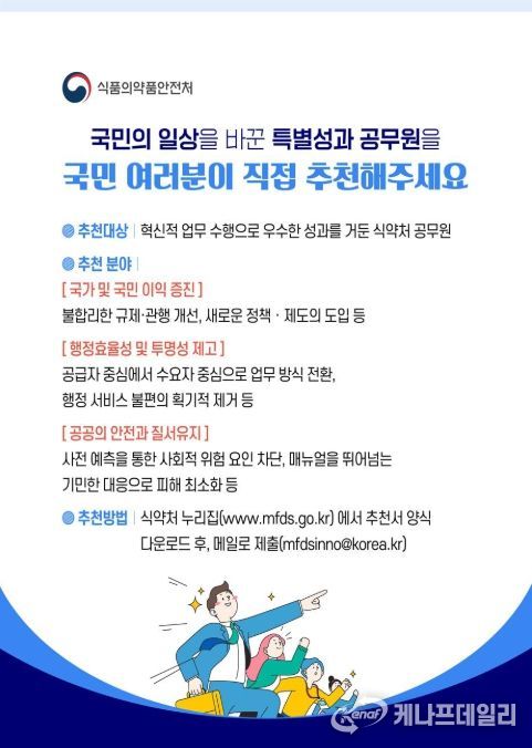케나프데일리 이은성 기자 | 식품의약품안전처는 국민이 체감하는 탁월한 성과를 창출한 공무원을 국민이 직접 추천해 포상하는 ‘국민추천제’를 1월 20일부터 운영한다고 밝혔다.