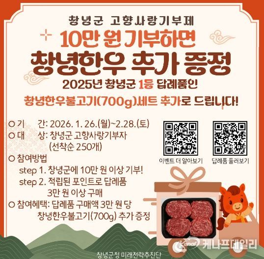 케나프데일리 이은성 기자 | 올해부터 고향사랑기부제 세액공제 10만~20만 원 기부 구간이 신설되면서 기부자 혜택이 확대됨에 따라, 창녕군은 설 명절을 앞두고 ‘창녕한우 추가 증정 이벤트’를 마련했다.