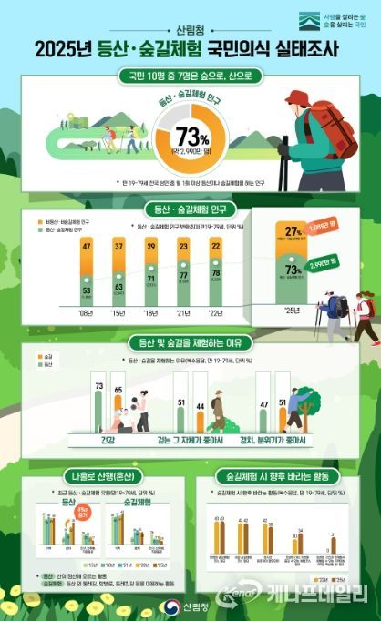 케나프데일리 이은성 기자 | 산림청은 바람직한 등산·숲길체험 문화 구축을 위한 정책추진 자료 수집을 위해 실시한 ‘2025년도 등산 등 숲길체험 국민의식 실태조사’ 결과를 발표했다고 28일 밝혔다.