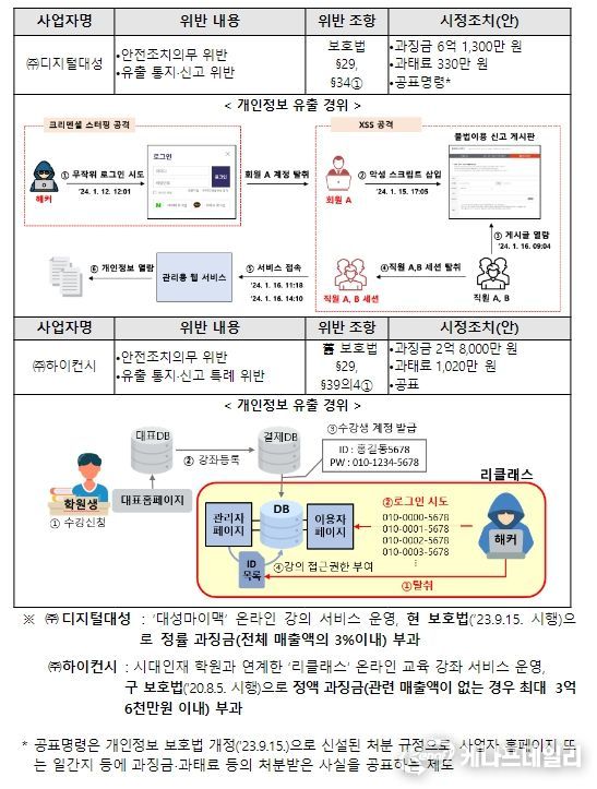 이들 2개 사업자는 인터넷 강의 사업자로, 입시를 준비하는 청소년이 주로 이용하고 있어 개인정보 유출에 각별한 주의를 기울일 필요가 있으나, 「개인정보 보호법」에 따른 안전조치와 개인정보 유출 통지 등의 의무를 위반하여 과징금과 과태료 부과 처분 등을 받게 됐다.