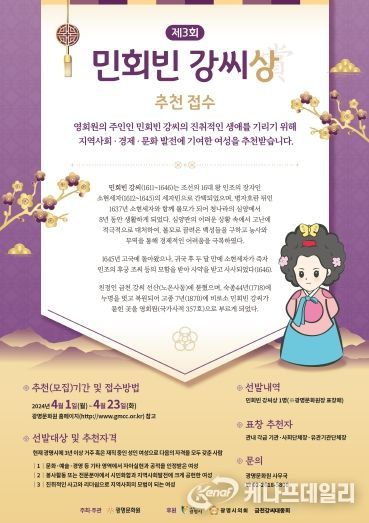 케나프데일리 이은성 기자 | 광명문화원은 1일부터 올해 제3회 민회빈 강씨상 표창 후보자를 추천·접수 받는다.