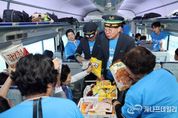 케나프데일리 이은성 기자 | 장흥군은 24일 운행된‘정남진 장흥 통일열차’에서 추억의 기차 콘셉트의 프로그램을 운영해 참가자들에게 특별한 추억을 선사했다고 밝혔다. 이번 프로그램은 철원 평화안보 현장을 견학하기 위한 통일열차 속, 기차 안에서 함께 소통하고 즐기는 특별한 시간을 위해 마련됐다. 열차 내에서는 과거 무궁화호의 카트 서비스를 재현한 간식 판매 이벤트가 진행됐다. 김성 장흥군수와 김재승 군의장이 옛날 역무원 복장을 하고 객차 사이를 오가며 탄산음료, 오징어, 땅콩 등 추억의 간식을 직접 판매해 참가자들의 호응을 받았다. 또한 객차 내 방송 시스템을 활용해 역무원 안내 방송을 패러디한 재치 있는 멘트를 선보이며 열차 분위기를 한층 더 밝게 만들었다. “잠시 후 등장하는 간식 카트는 여러분의 추억과 함께 달리고 있습니다. 통일로 향하는 열차에 탑승하신 것을 환영합니다” 등 유쾌한 멘트가 흘러나올 때마다 객차마다 웃음과 박수가 터져 나왔다. 한 참가자는 “철원으로 가는 길이 정말 즐거웠다. 진짜 옛날 기차를 타고 있는 기분이었다”며 소감을 전했다. 특히 이