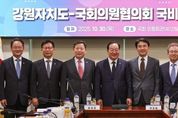 케나프데일리 이은성 기자 | 김진태 강원특별자치도지사는 10월 30일 오후 2시, 국회 의원회관에서 도내 지역구 국회의원 7명과 함께 도 국회의원협의회를 열고 2026년도 국비 추가 확보 방안 등을 논의했다. 이번 간담회는 2026년도 정부예산안의 국회 심의가 본격화되는 시점에 맞춰 도와 지역 국회의원 간 협력체계를 강화하기 위해 마련된 자리로, 김 지사를 비롯해 지역구 국회의원 보좌진이 참석해 예산 확보 전략을 중심으로 실무적인 논의를 진행했다. 이 자리에서 도는 올해 국비 10조 원 시대를 처음으로 연 성과를 바탕으로 정부 예산안에 미반영된 24개 사업(총 612억 원)의 국비 추가 확보 방안을 논의하고, 해당 사업들이 국회 심의 과정에서 반드시 반영될 수 있도록 국회의 적극적인 협력을 요청했다. 이와 함께 ▲용문~홍천 광역철도 예타 통과 ▲삼척~강릉 고속화철도 예타 통과 ▲포천~철원 고속도로 예타 통과 ▲소양8교 건설 국비 반영 ▲제5차 국가철도망 구축계획 및 제6차 국도‧국지도 건설계획 최대 반영 등 강원지역 주요 에스오시(SOC) 현안과제에 대해서도 폭넓은 논의가 이뤄졌다. 한기호 국회의원